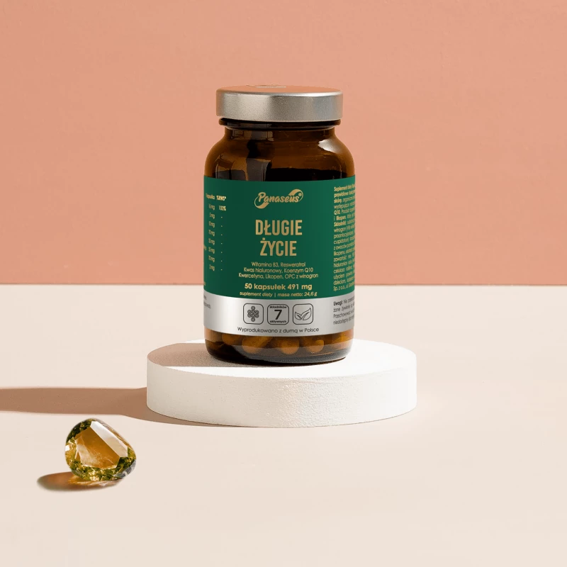 Składniki: substancja wypełniająca: celuloza mikrokrystaliczna; ekstrakt z pestek winogron (Vitis vinifera) standaryzowany na zawartość min. 95% OPC (oligomeryczne proantocyjanidyny), ekstrakt z korzenia rdestowca japońskiego (Polygonum cuspidatum) standaryzowany na zawartość min. 50% trans-resweratrolu, ekstrakt z owoców pomidora (Solanum lycopersicum) standaryzowany na zawartość min. 5% likopenu, ekstrakt z perełkowca japońskiego (Sophora japonica) standaryzowany na zawartość min. 98% kwercetyny, amid kwasu nikotynowego (witamina B3), hialuronian sodu (kwas hialuronowy), ubichinon (koenzym Q10).