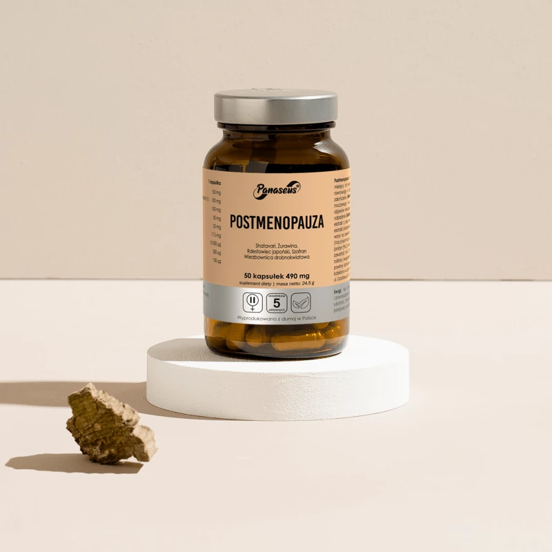 Składniki: ekstrakt z korzenia shatavari (Asparagus racemosus) 10:1, ekstrakt z ziela wierzbownicy drobnokwiatowej (Epilobium parviflorum) 10:1, ekstrakt z korzenia rdestowca japońskiego (Polygonum cuspidatum) standaryzowany na zawartość min. 50% trans-resweratrolu, ekstrakt z owoców żurawiny (Vaccinium macrocarpon) standaryzowany na zawartość min. 50% proantocyjanidyn (PAC), ekstrakt ze znamion szafranu (Crocus sativus) standaryzowany na zawartość min. 2% krocyny oraz min. 1% safranalu.