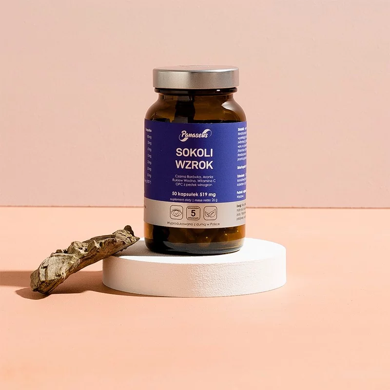 Składniki: Ekstrakt z owoców czarnej borówki (Vaccinium myrtillus) standaryzowany na zawartość min. 25% antocyjanów, ekstrakt z owoców aronii (Aronia melanocarpa)standaryzowany na zawartość min. 15% antocyjanów, kwas L-askorbinowy (witamina C), inulina; ekstrakt z liści rukwi wodnej (Nasturtium officinale) DER 20:1, ekstrakt z pestek winogron (Vitis vinifera) standaryzowany na zawartość min. 95% OPC (oligomeryczne proantocyjanidyny).