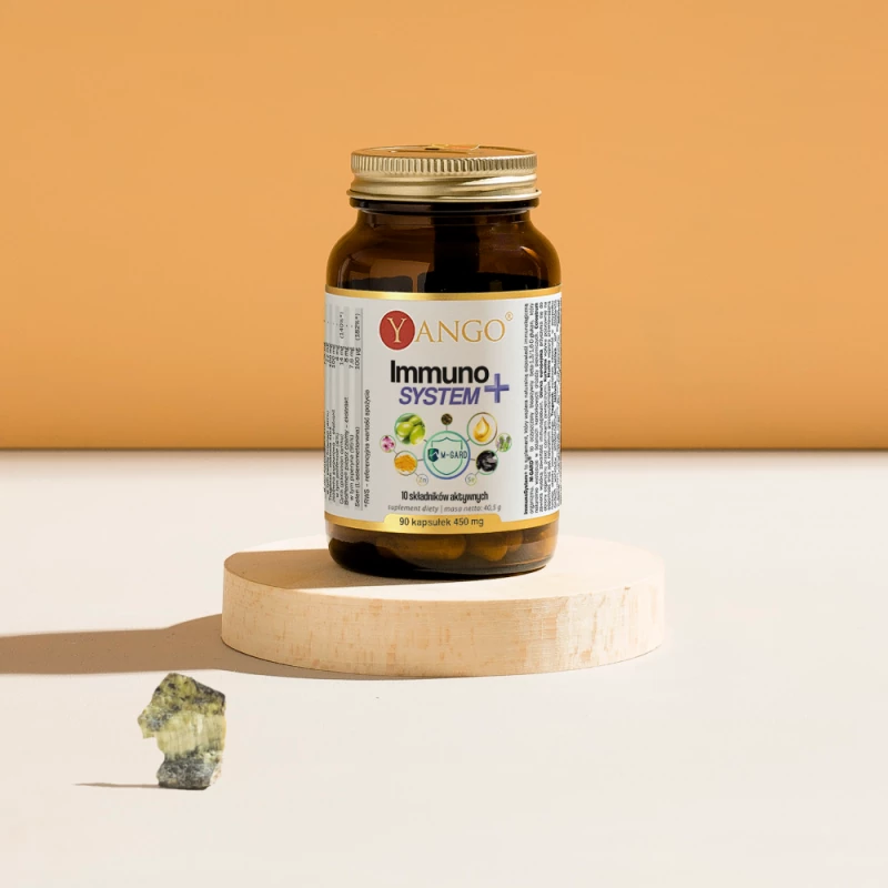 Składniki: beta-1,3/1,6-D-glukan z drożdży piekarskich M-GARD® Saccharomyces cerevisiae, ekstrakt z colostrum wołowego (z mleka) standaryzowany na zawartość min. 60% protein (w tym immunoglobiny min. 40%), ekstrakt z liści oliwki europejskiej (Olea europaea) standaryzowany na zawartość min. 40% oleuropeiny, ekstrakt z kurkumy (Curcuma longa) standaryzowany na zawartość min. 95% kurkuminoidów, ekstrakt z mumio (shilajit) standaryzowany na zawartość min. 40% kwasów fulwowych, ekstrakt z traganka (Astragalus membranaceus) 10:1, ekstrakt z jeżówki purpurowej (Echinacea purpurea) standaryzowany na min. 4% polifenoli, pikolinian cynku (cynk), L-selenometionina (selen), ekstrakt z czarnego pieprzu BioPerine® (Piper nigrum) standaryzowany na zawartość min. 95% piperyny.