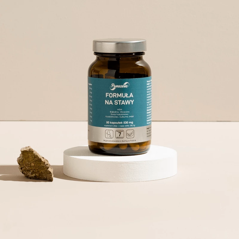 Składniki: Metylosulfonulometan, inulina, ekstrakt z kłącza tarczycy bajkalskiej (Scutellaria baicalensis) standaryzowany na zawartość min. 85% bajkaliny, ekstrakt z żywicy kory kadzidłowca indyjskiego (Boswellia serrata) standaryzowany na zawartość min. 65% kwasów bosweliowych, ekstrakt z kłącza kurkumy indyjskiej (Curcuma longa) 10:1, ekstrakt z kłącza imbiru lekarskiego (Zingiber officinale) 10:1, ekstrakt z kłącza czepoty puszystej (Uncaria tomentosa) 10:1, niskocząsteczkowy hialuronian sodu (kwas hialuronowy).